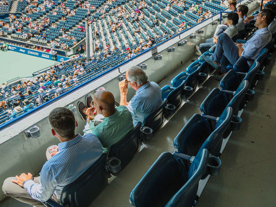 I photographed a York University networking event held at the Rogers Tennis Club, capturing guests enjoying casual conversations, light snacks, and drinks while watching live tennis matches.